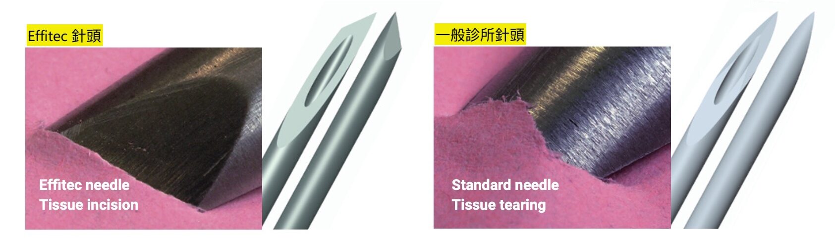 • 搭配 Effitec針頭專利切面設計,減少第一下進針的痛感。